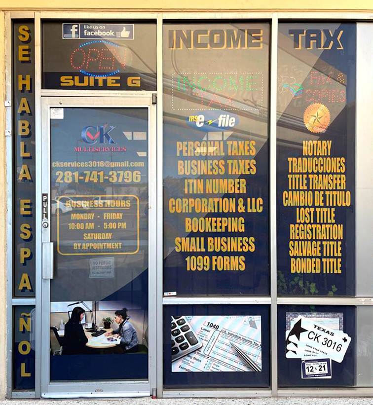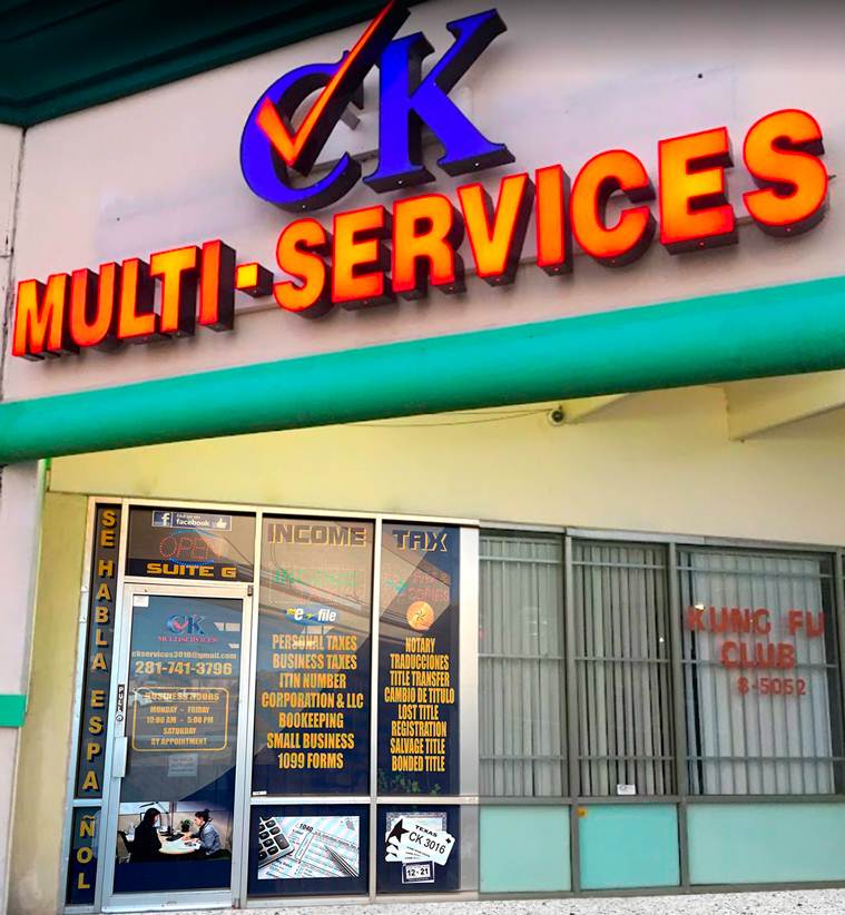 CK Tax Multiservice es un proveedor líder de servicios legales y financieros. Ofrecemos una multitud de servicios profesionales que incluyen, entre otros, preparación de impuestos, traducción de documentos, contabilidad, notarización y transferencias de títulos. Hemos estado sirviendo a nuestra comunidad durante 15 años y nos enorgullecemos de ofrecer un producto de calidad de manera oportuna con un servicio al cliente excepcional.
